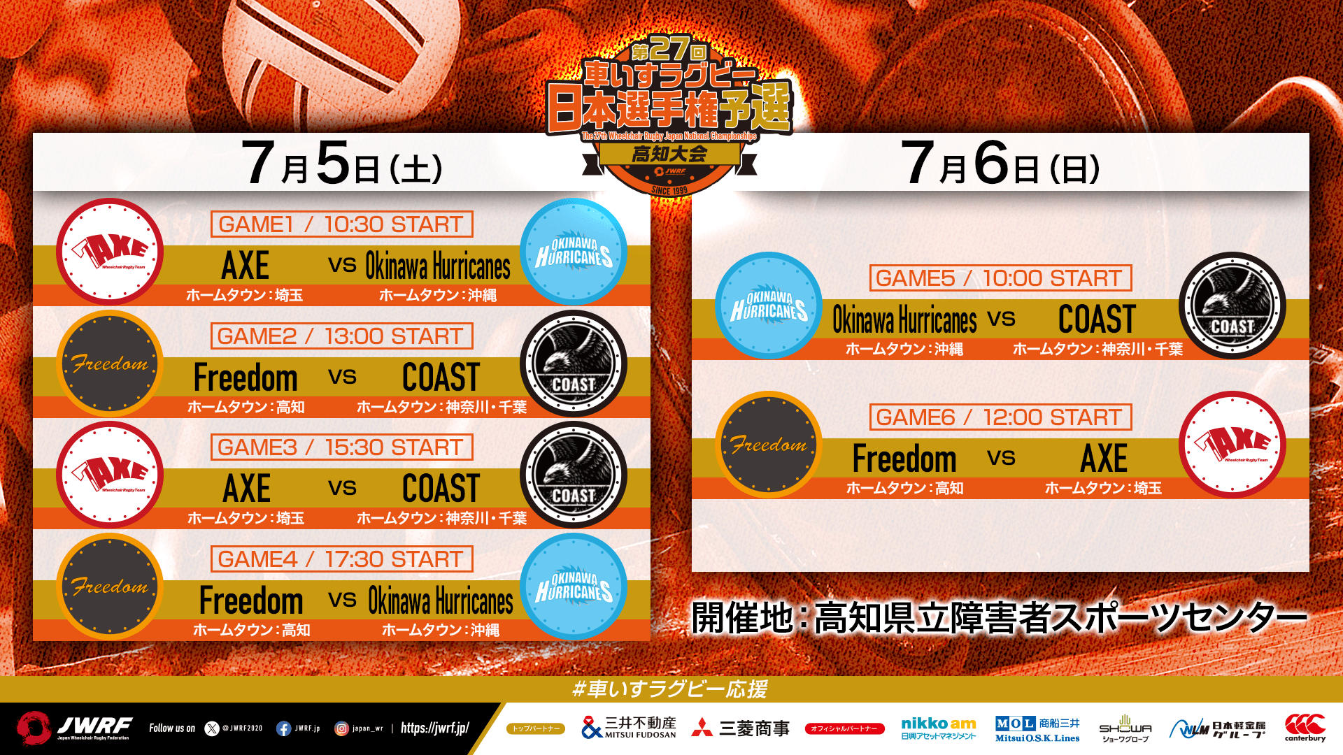 In this qualifying, the 27th Wheelchair Rugby Japan Championship Qualifier will be held in Kochi Prefecture. Based on the ranking determined at the 26th Wheelchair Rugby Japan Championship held in December last year, the first qualifying league will be held in Kochi, Fukuoka and Hyogo. In addition, the 2nd qualifying league will be held in Hokkaido, Saitama, and Kanagawa between the 1st and 2nd teams, and the 3rd to 4th teams in the 1st qualifying league, and the qualifier ranking will be determined. Teams who entered the top 8th qualifying will participate in the 27th Wheelchair Rugby Japan Championship held at Chiba Port Arena from December 12 to 14.