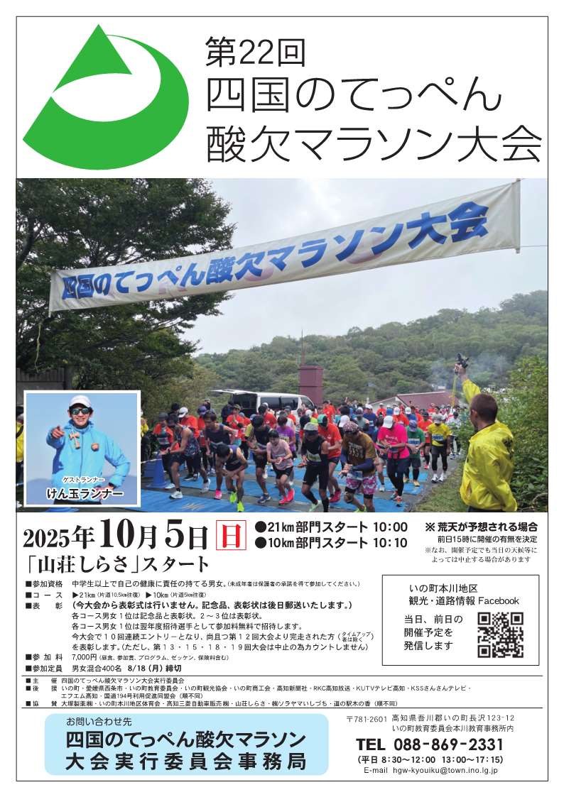 A marathon event will be held on the highest elevation road in Shikoku (1,400m to 1,700m), the town road Kamegamori Line. You can enjoy the marathon while promoting exchange and fellowship among various people inside and outside the prefecture, and touching the magnificent natural beauty of the Shikoku Mountains.