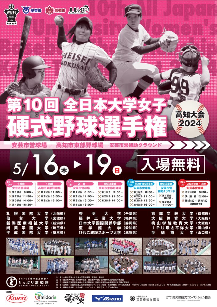 This year, the 10th All Japan University Women's Rigid Baseball Championship Kochi Tournament will be held by 15 universities nationwide in Kochi Prefecture to determine the Spring University Women's Rigid Baseball Champion. Please watch at the stadium full of splendidness, strength, smile and youth as much as the men of women's hardball baseball.