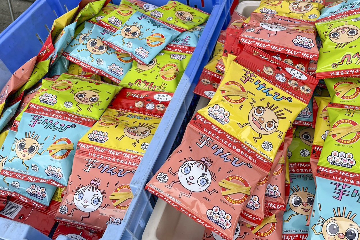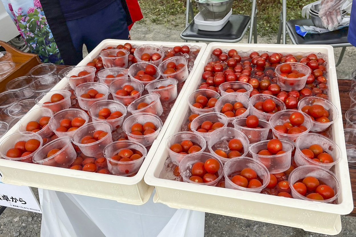 Soon we arrived at the 1st Aid. Here are "Fruit Tomato" from Hidaka Village and Kochi's specialty sweets "Imo Kenpo".