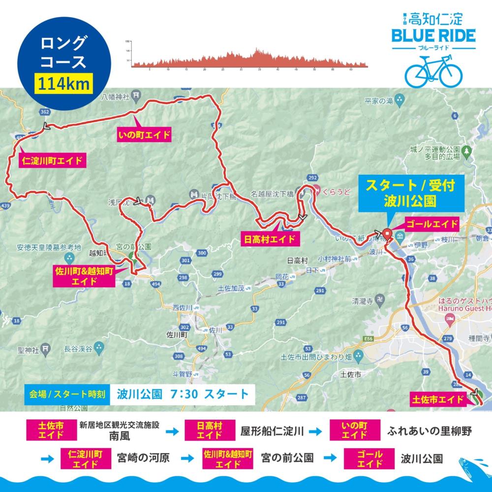 There are two courses: a long course of 114km and a short course of 65km. It is relatively gentle and has a time limit of about 8 hours, so you can run leisurely while watching the superb view of the Niyodo River.