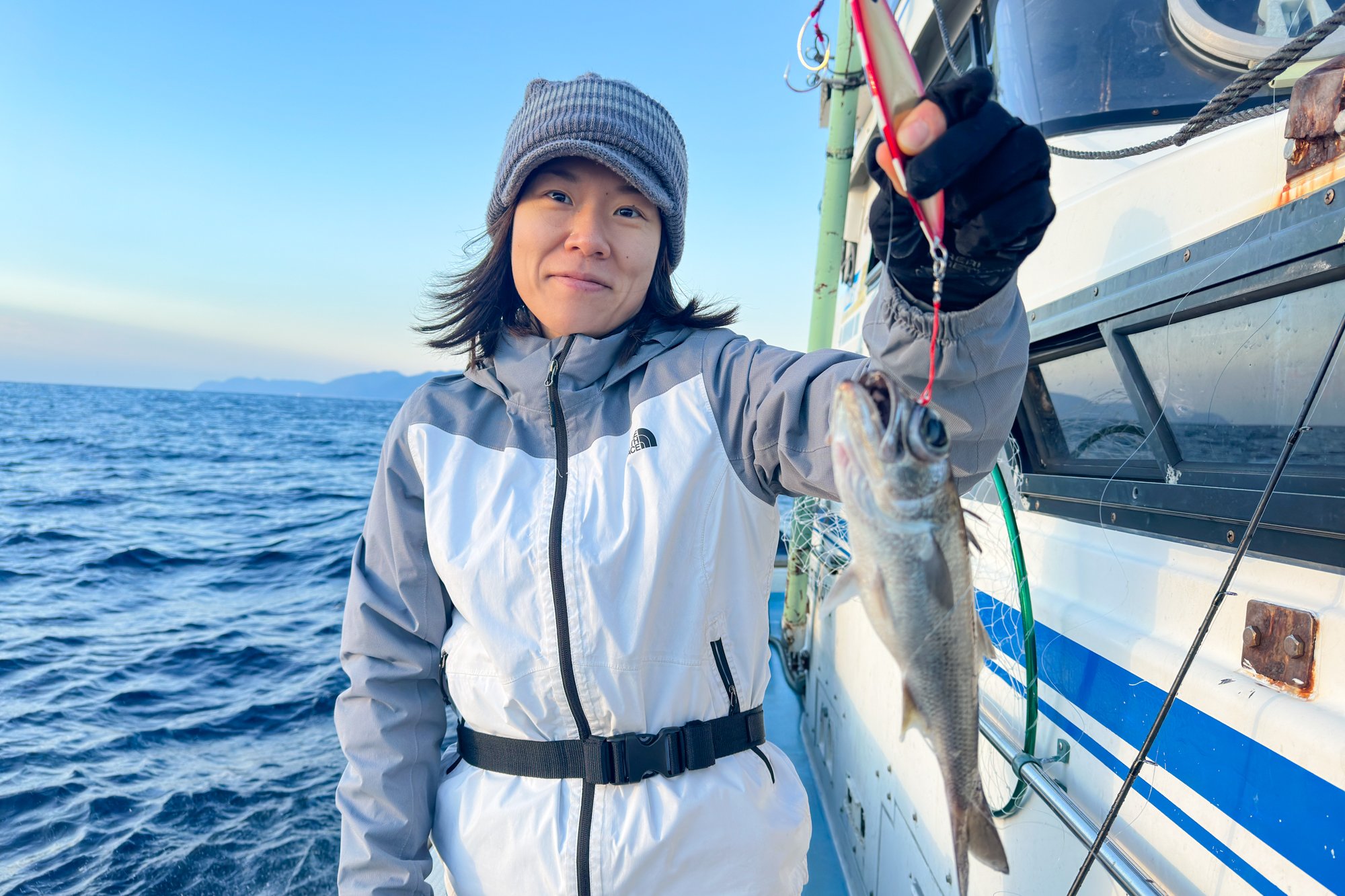 Participants will put metal jig in front of us. When the metal jig falls on the sea floor, swing the pole slowly and largely and move the metal jig underwater to induce a throat. The first fish caught was a woman who participated from Tokushima Prefecture, a neighbor of Kochi Prefecture.