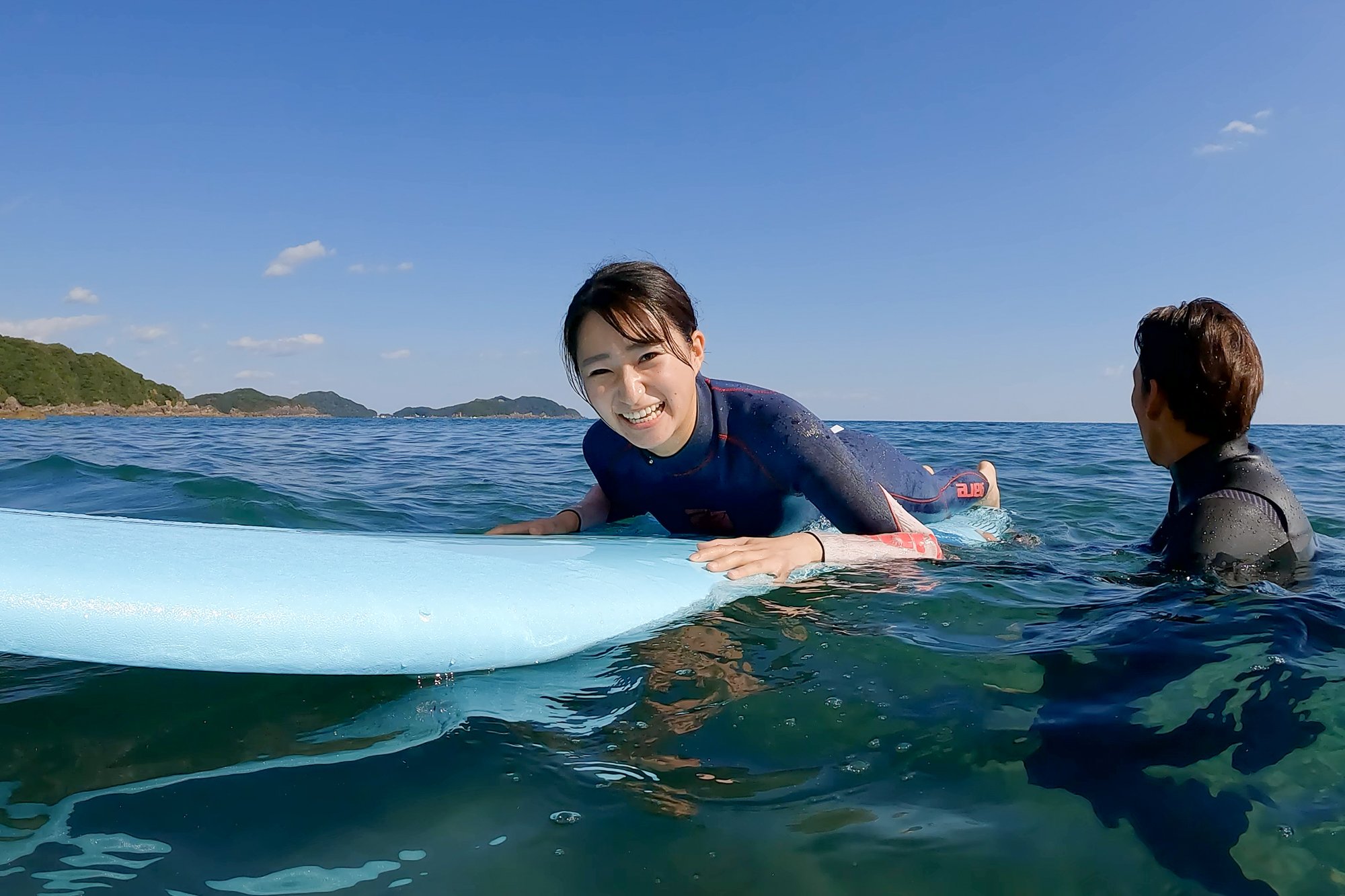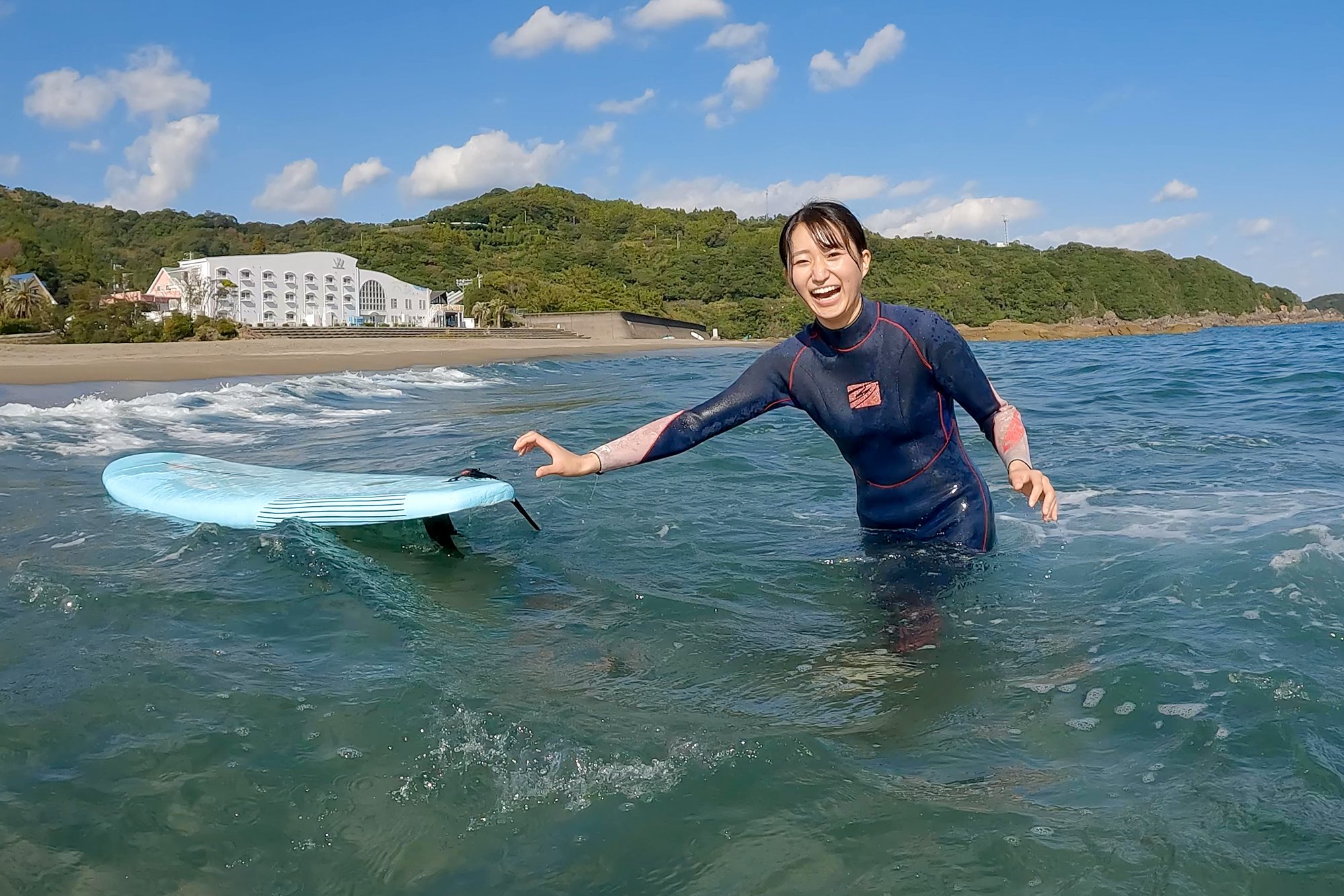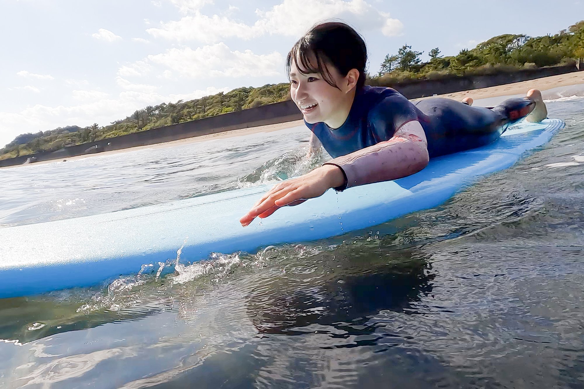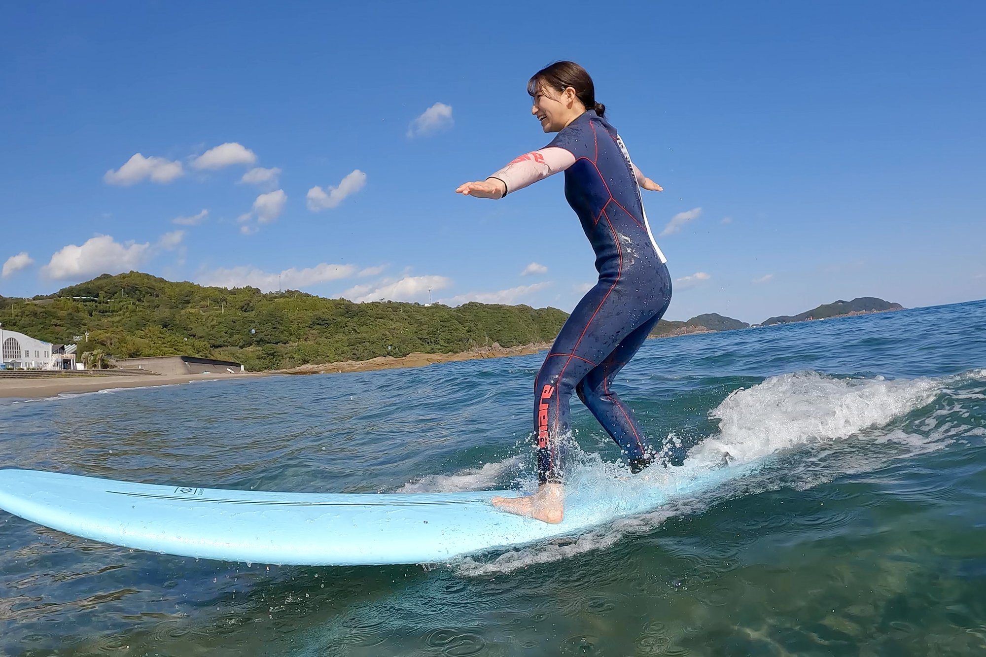 "I like marine sports generally, but especially surfing has the image of "This is the sea!" And it was a longing sport, so I'm really looking forward to this time. It's my first challenge, so it's difficult to ride the waves and I'm a little worried about getting on the board well, but the goal is to keep the speed without losing balance to the sandy beach! "Mr. Ikeda looks at the sea with sparkling eyes.