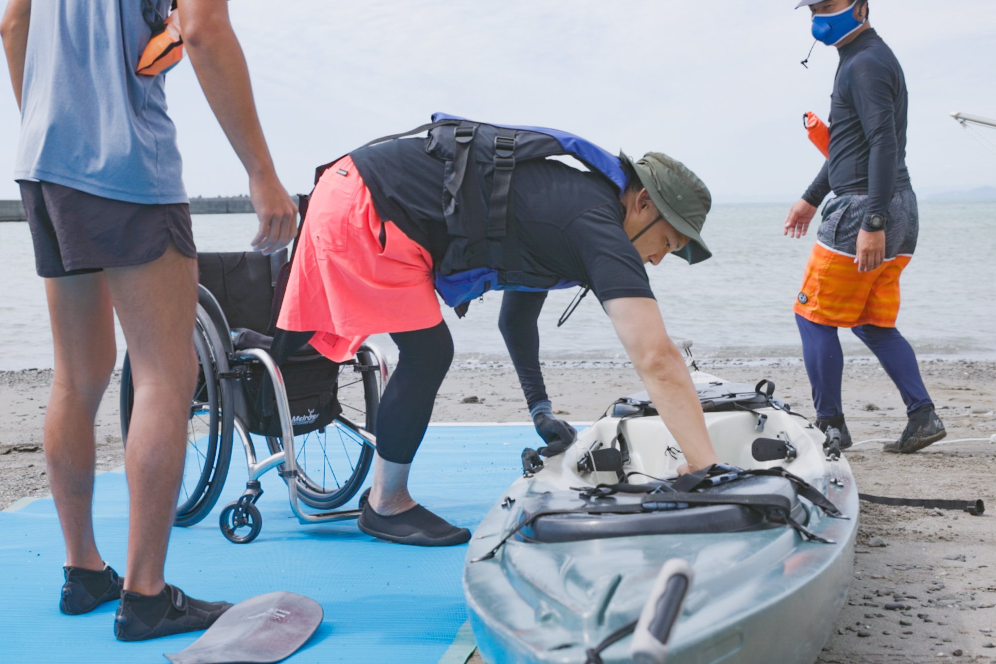 On the beach, there was a dedicated beach mat that could be used in wheelchairs. Mr. Ike moves to the shore and gets on the kayak.