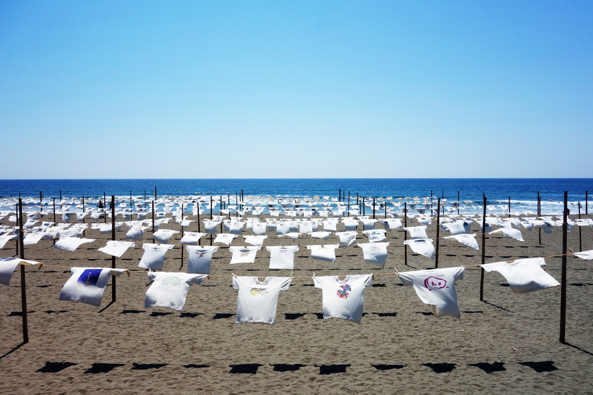 "T-Shirt Art Exhibition" is a work that looks like a T-shirt as a canvas and draws a variety of unique designs flutters in the wind on the sandy beach. The "Beesan Flying Tournament" is a sand coat with a length of 35 meters and a width of 5 meters on a sandy beach where many T-shirts are swaying, kicking off the beach sandals far away, and competing for distance.