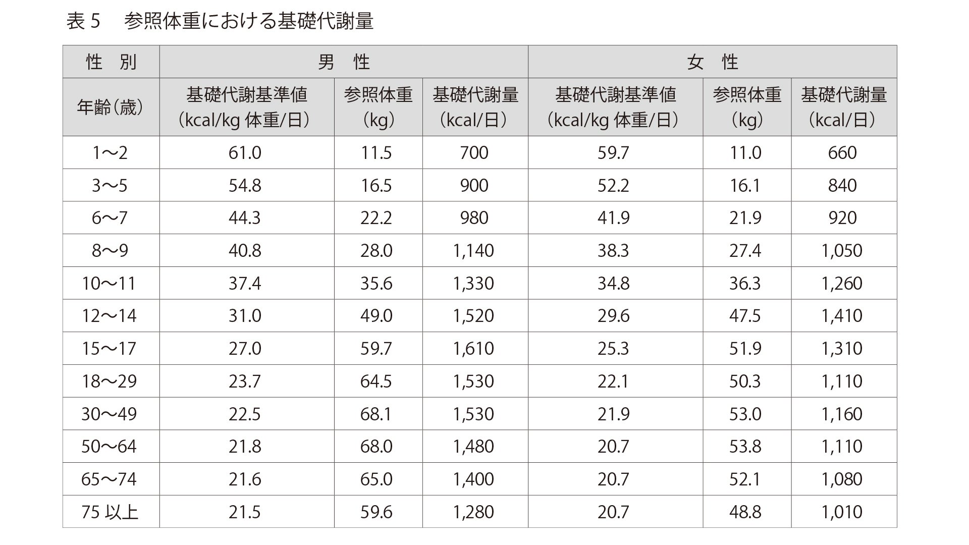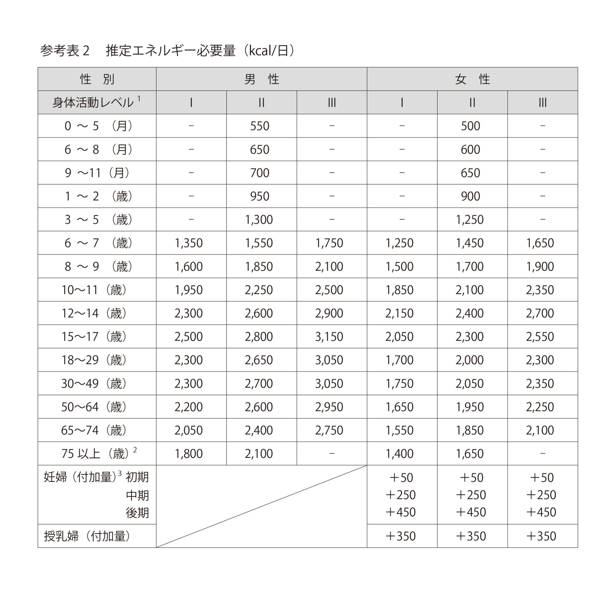There are two types of calories: "calories ingested" consumed in meals, etc., and "calories consumed" consumed by maintaining the body and exercising. First of all, let's know the amount of energy required for daily life = calorie intake. The table below is an excerpt from the Ministry of Health, Labour and Welfare's "Japanese dietary intake standard (2020 version) of calorie intake per day.