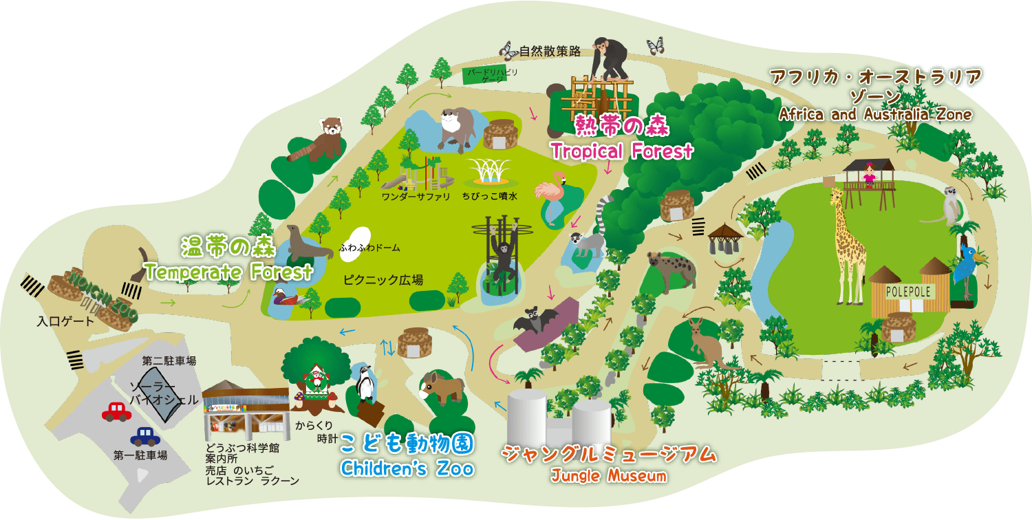 Noichi Zoological Park where about 1,100 animals of about 100 species live. About 20 hectares of the park consists of four zones: "Temperate Forest", "Tropical Forest", "Africa-Australia Zone", and "Jungle Museum", and "Children's Zoo". When you hear 20 hectares, you may think, "It's hard to walk!" But in fact, you can walk slowly one lap in about two hours.