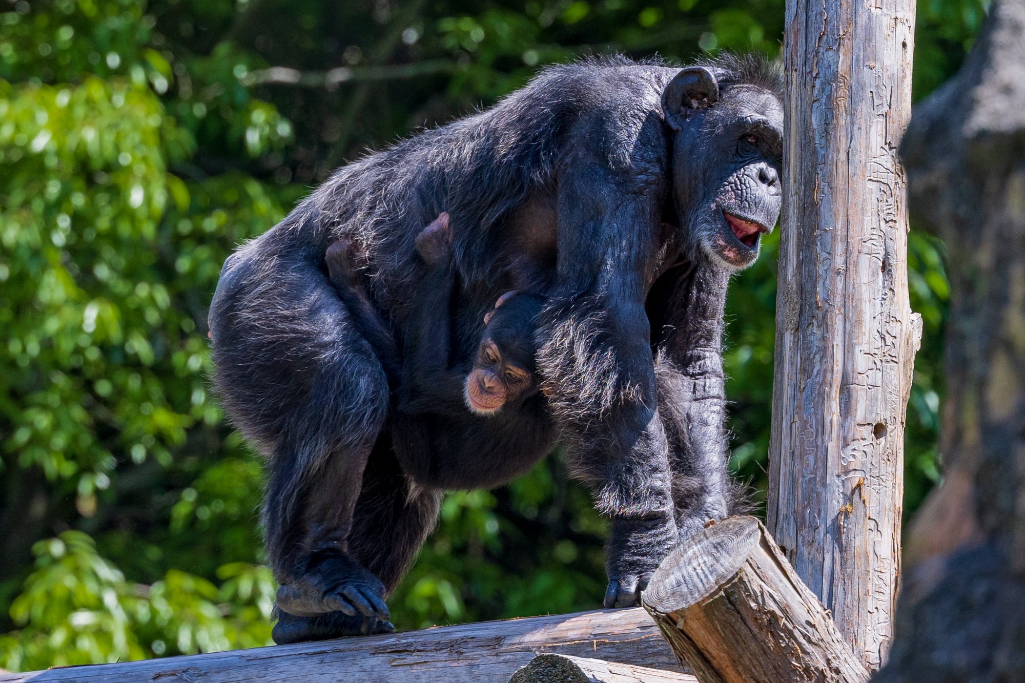 One-year-old Akaru is holding firmly in the stomach of her mother coral and taking a walk together.