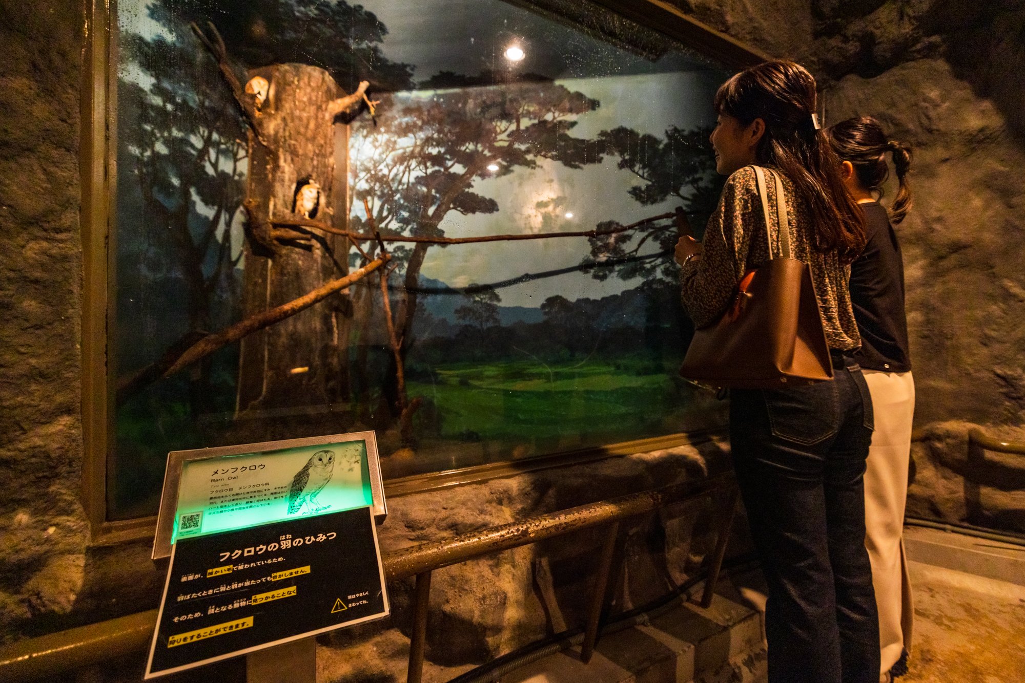 A cave area where you can see nocturnal animals, such as men owls and Egyptian rouset giant bats flying in the dark.