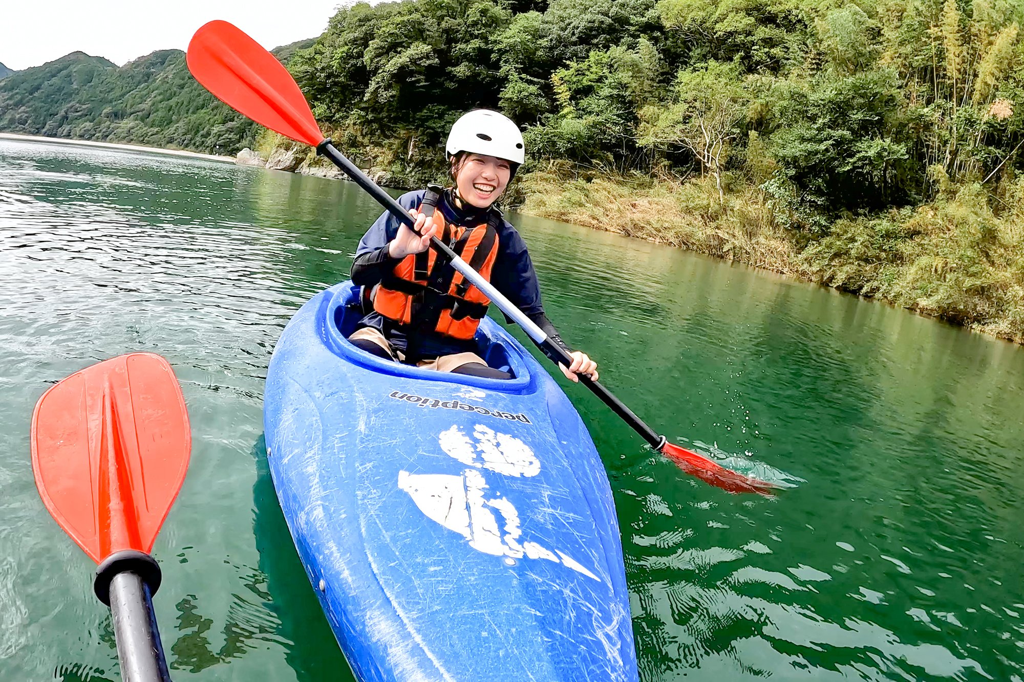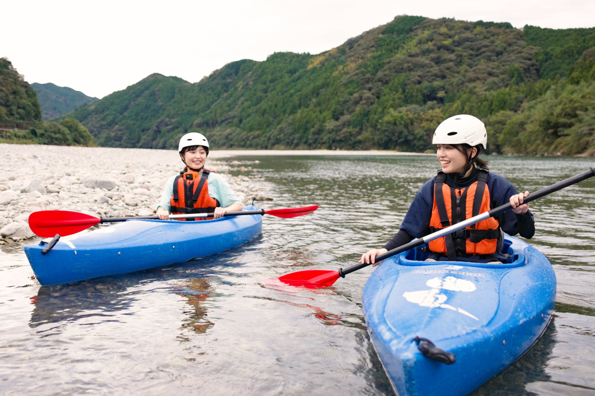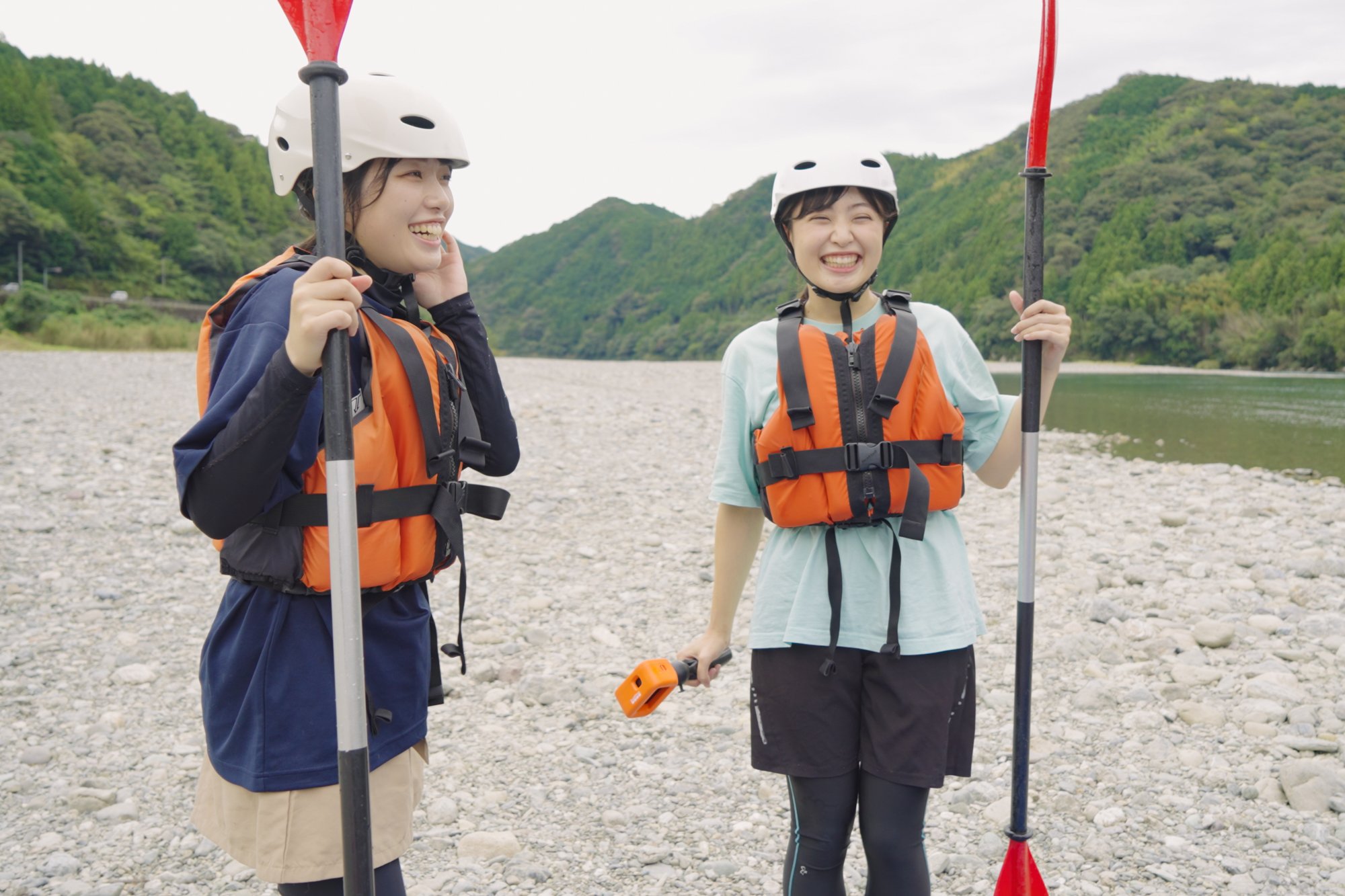 Mr. Takezawa and Mr. Akiyama experienced the plan of the Niyodo River activity plan provided by the outdoor facility "River Cruise" in Tosa Washi Craft Village QRAUD. The canoe used by the two people is also called "kayak" where you can stretch your legs and sit down and row water with a double paddle. It is mainly used in rivers that flow fast, and is characterized by small turns and easy to operate. Wear a helmet and life jacket in preparation for overthrowing or falling, and wear water shoes that are difficult to remove to protect your feet from riverbanks and underwater rocks. For summer clothes, we recommend fast-drying clothes that can be wet. In spring and autumn, you can enjoy it with peace of mind by wearing a special wet suit.