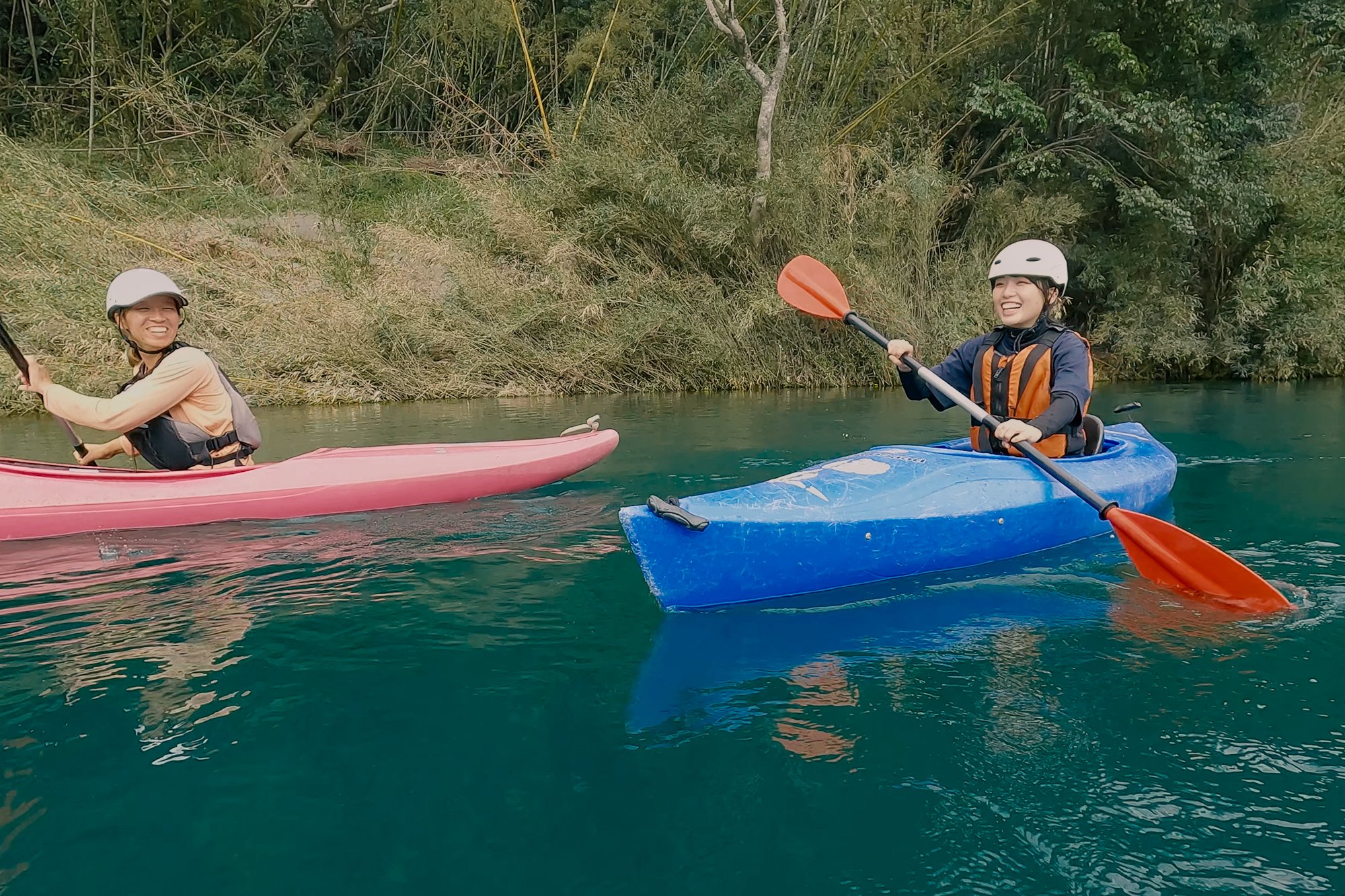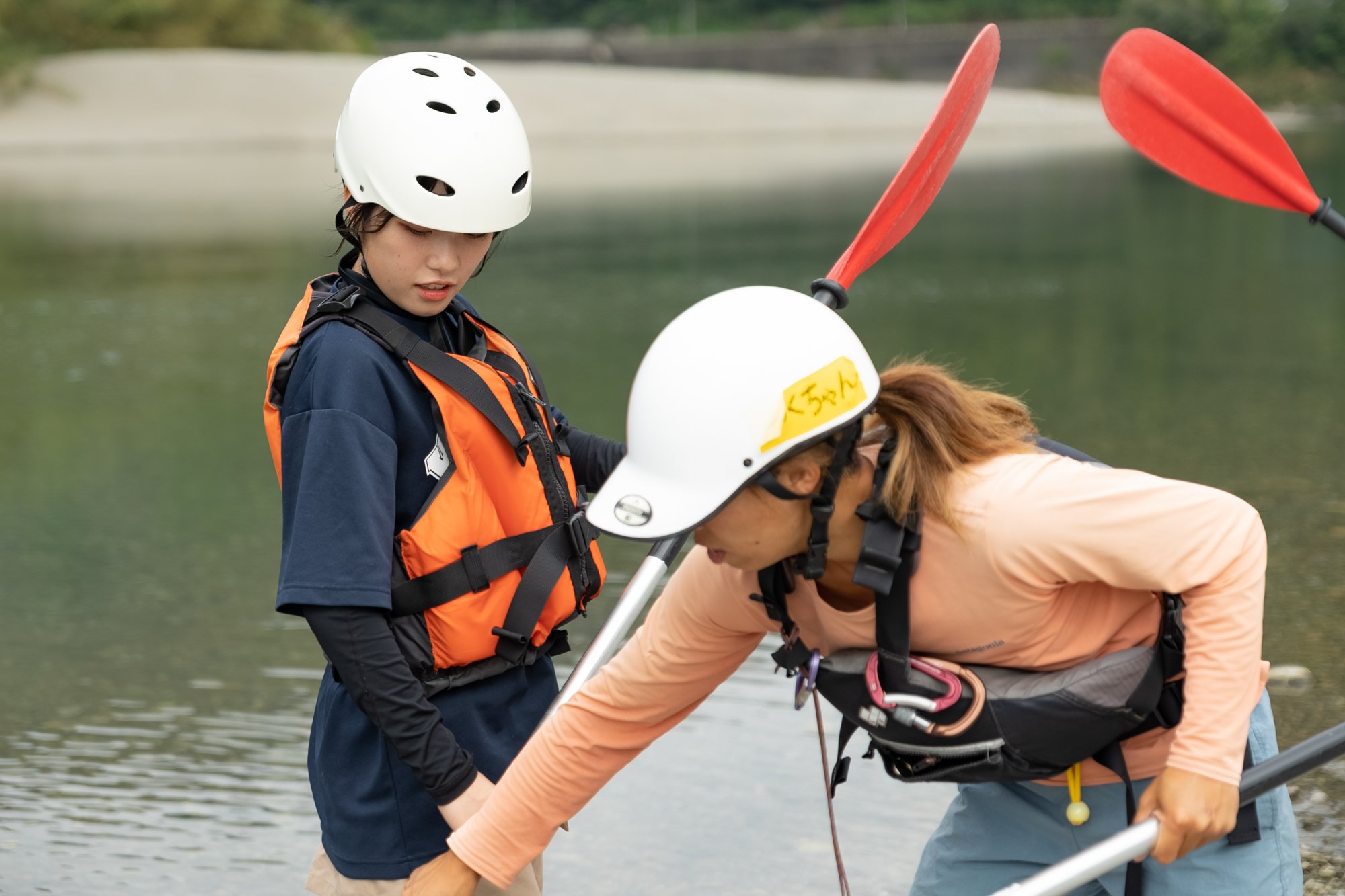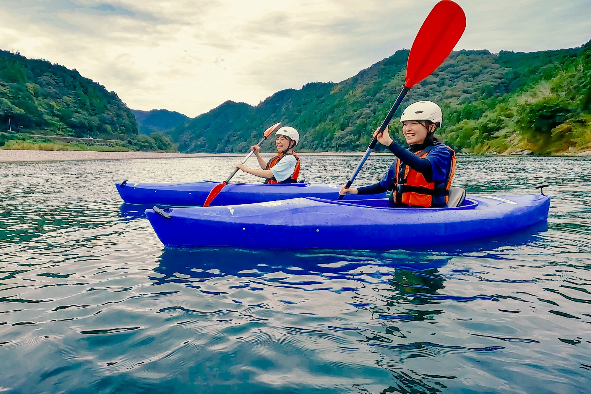 Mr. Takezawa and Mr. Akiyama experienced the plan of the Niyodo River activity plan provided by the outdoor facility "River Cruise" in Tosa Washi Craft Village QRAUD. The canoe used by the two people is also called "kayak" where you can stretch your legs and sit down and row water with a double paddle. It is mainly used in rivers that flow fast, and is characterized by small turns and easy to operate. Wear a helmet and life jacket in preparation for overthrowing or falling, and wear water shoes that are difficult to remove to protect your feet from riverbanks and underwater rocks. For summer clothes, we recommend fast-drying clothes that can be wet. In spring and autumn, you can enjoy it with peace of mind by wearing a special wet suit.