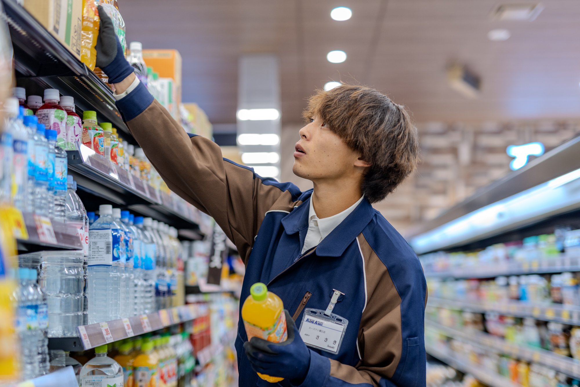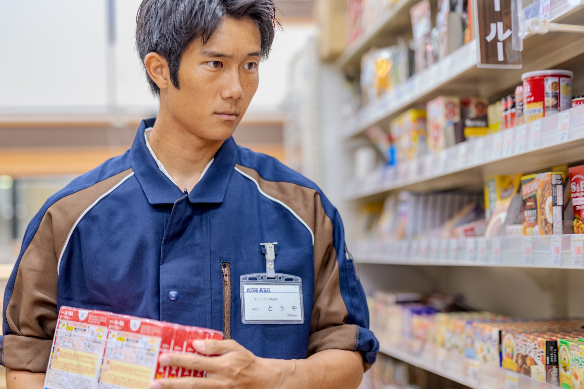 The Toke player is pushing on the soccer path to the pastique. He works at the Kanda store of Ace One Co., Ltd. I'm putting out the items here.