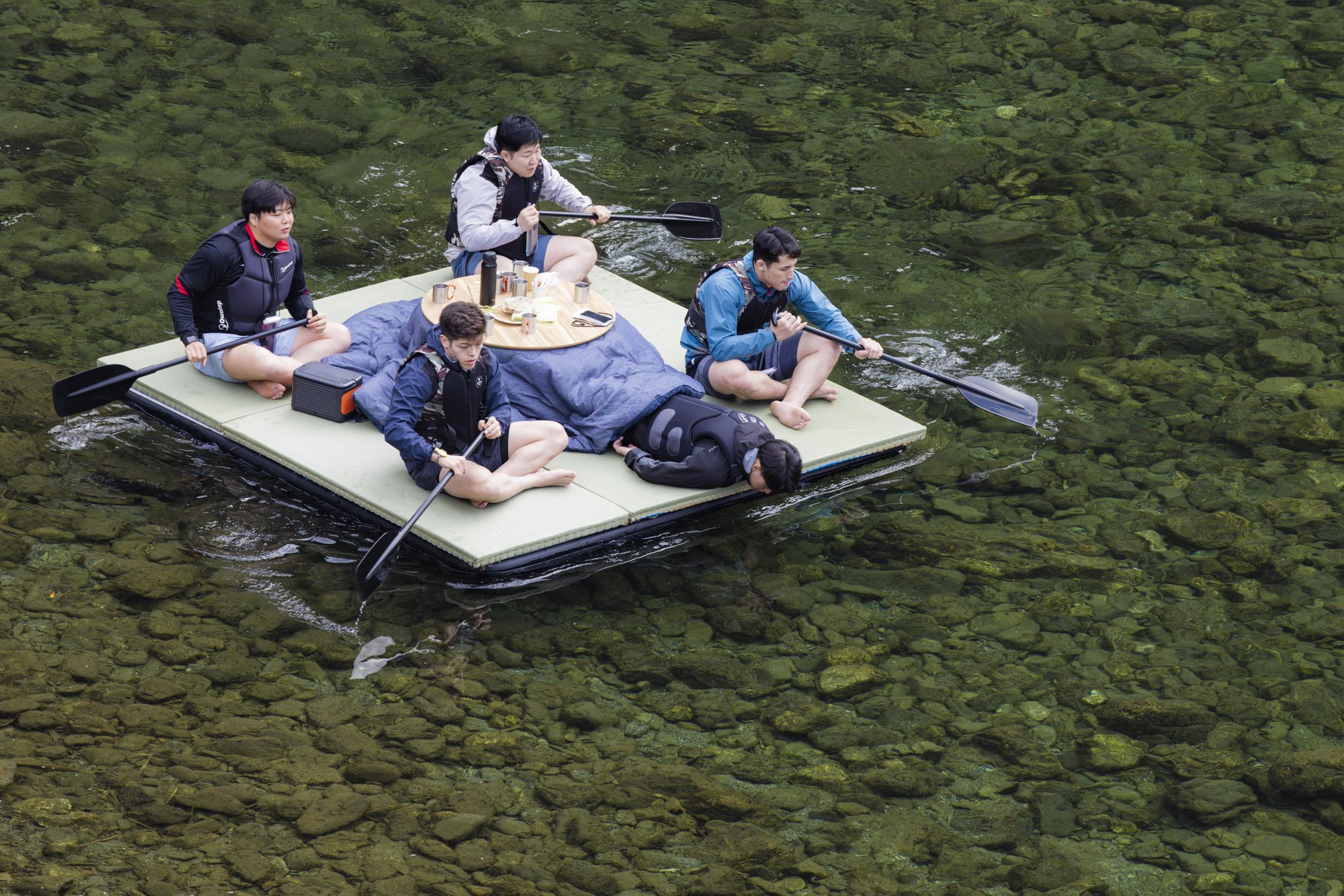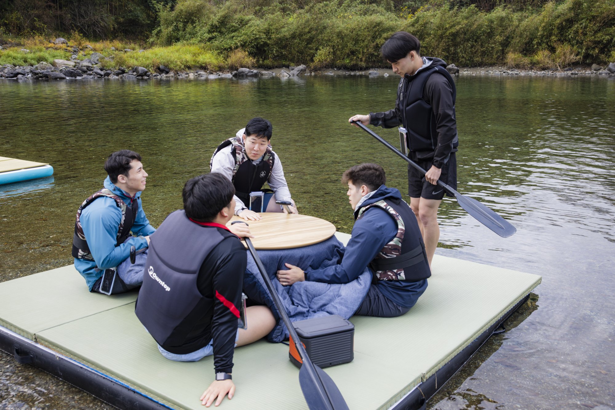 There are two water kotatsu prepared on the riverbank. Who's going to ride? After such a consultation, all five players went to one kotatsu together. You can see the good relationship between Jes Judo Club.