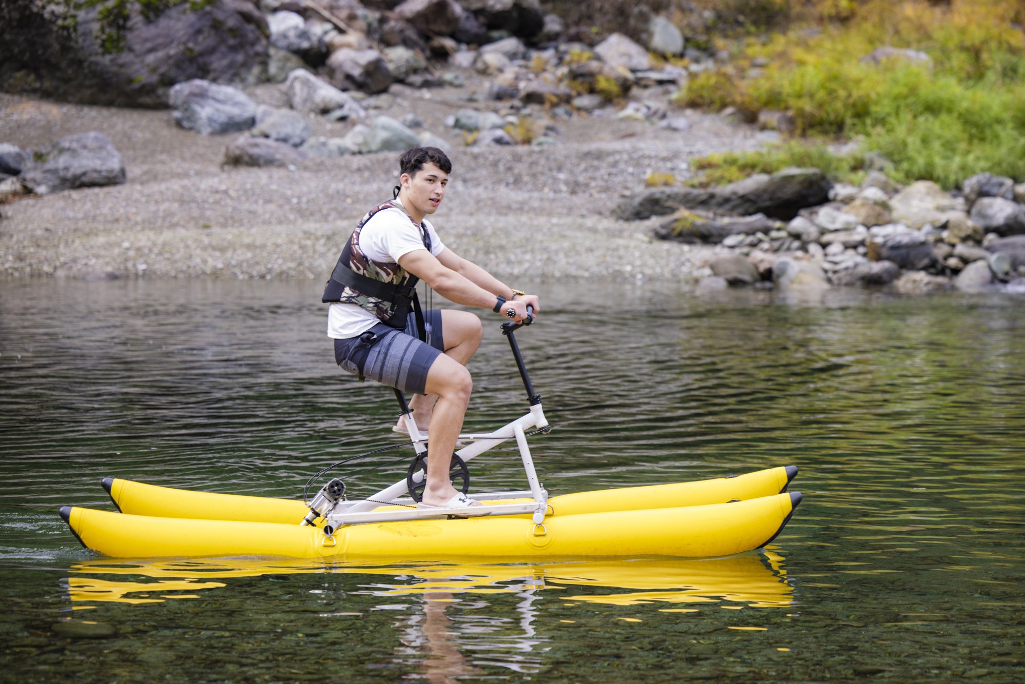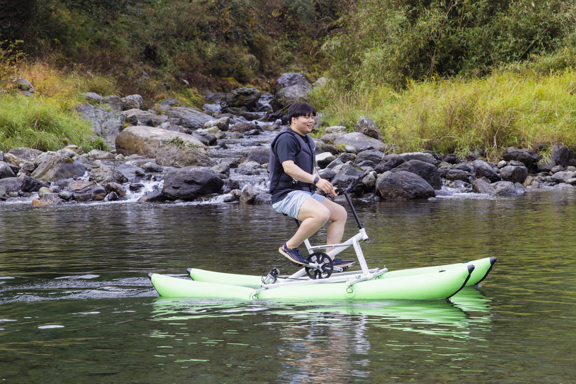 Takahashi and Saimoto challenge the water bike. “It’s very difficult to fly. "I don't go in the direction I want," he said, "It's not like a normal bicycle, but it's fun."