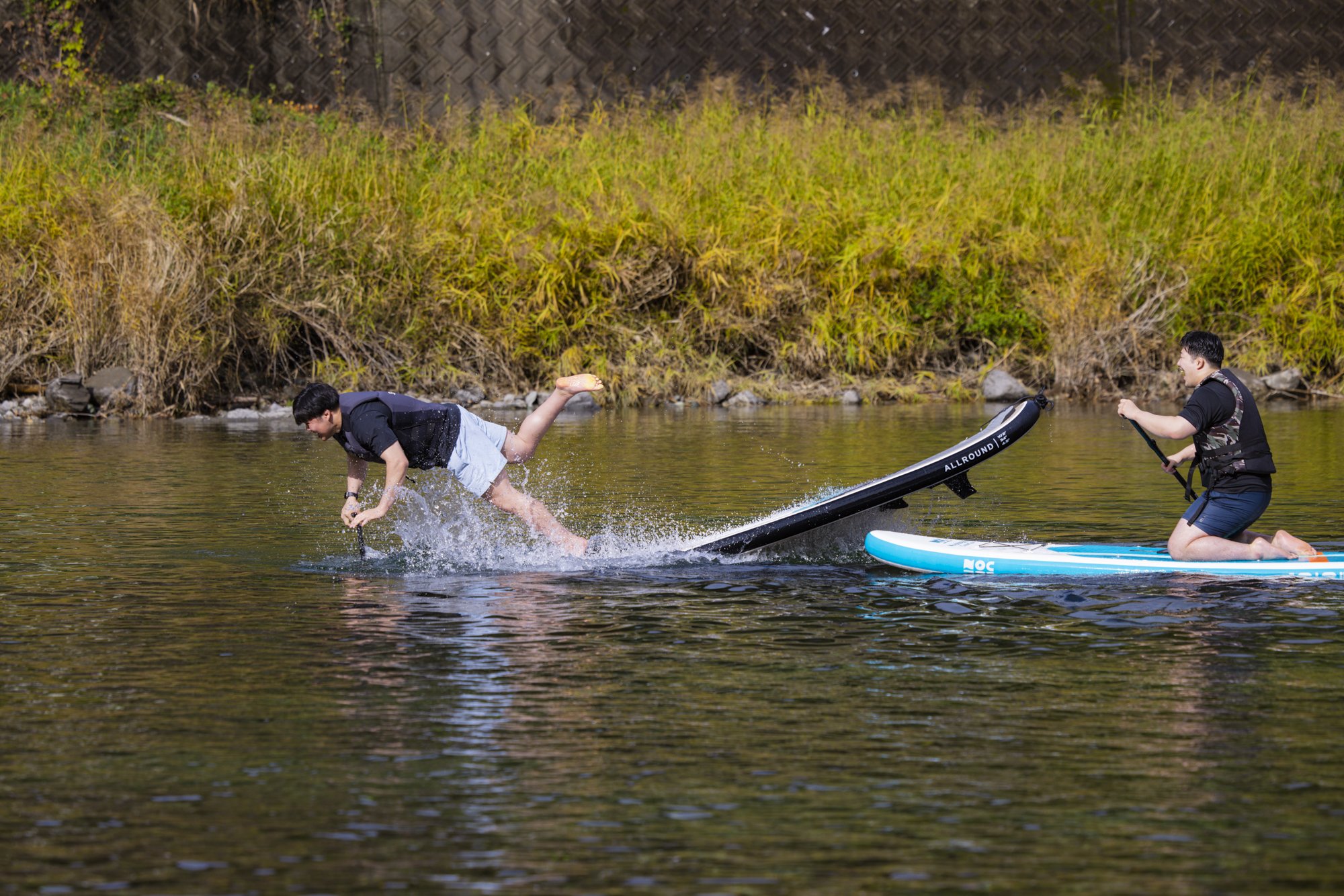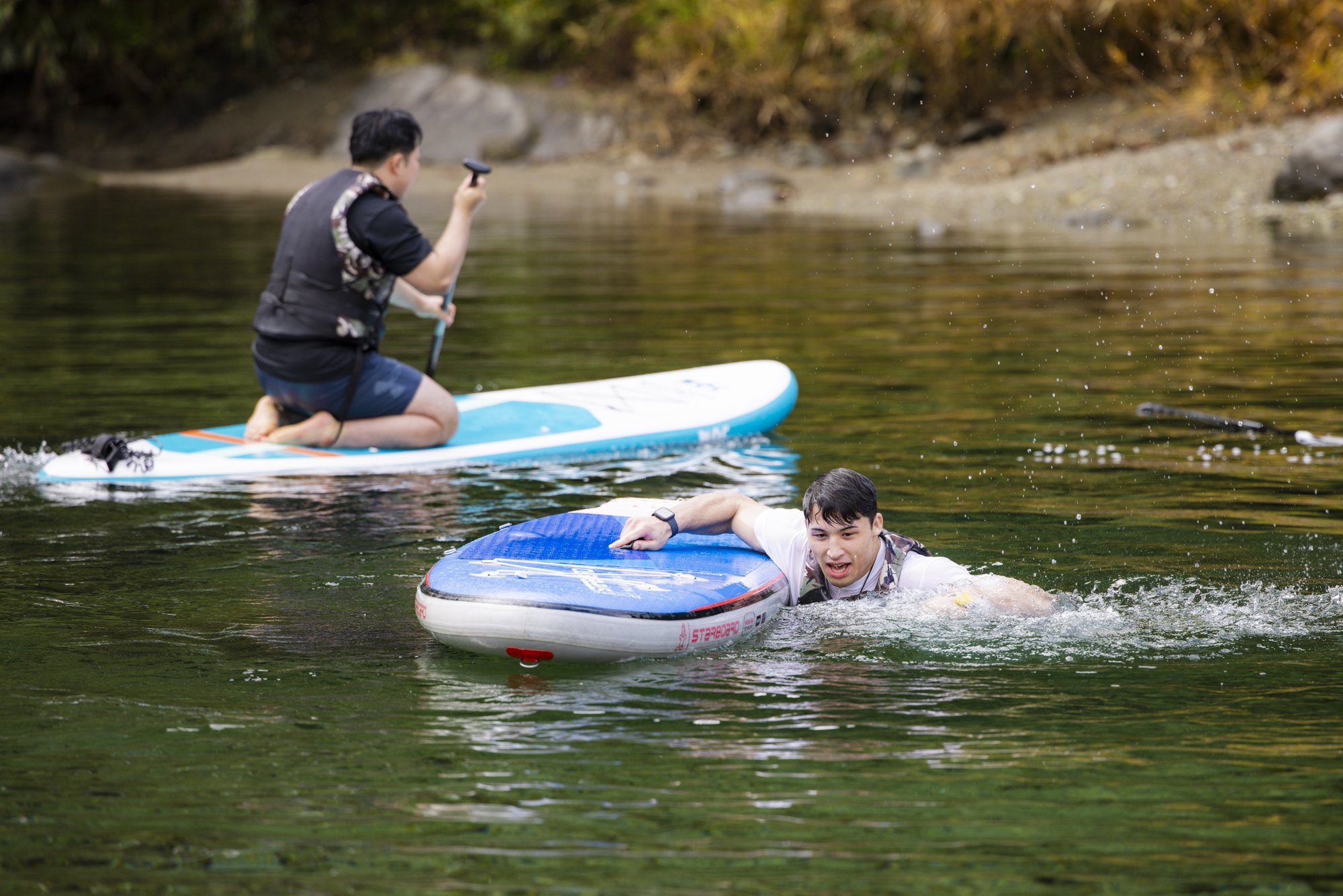 The players also challenge the SUP. I'm just training on a regular basis, so I can stand up and paddle right away. Meanwhile, Kinno, who has a strong service spirit, goes into the water! The directors and managers watching over the riverbank are very exciting. And Kanano twisted Takahashi and Saimoto and broke the balance, and everyone went into the river brilliantly. The players who returned to the riverbank laughing, "Cold ~" were warming their bodies in the sauna.