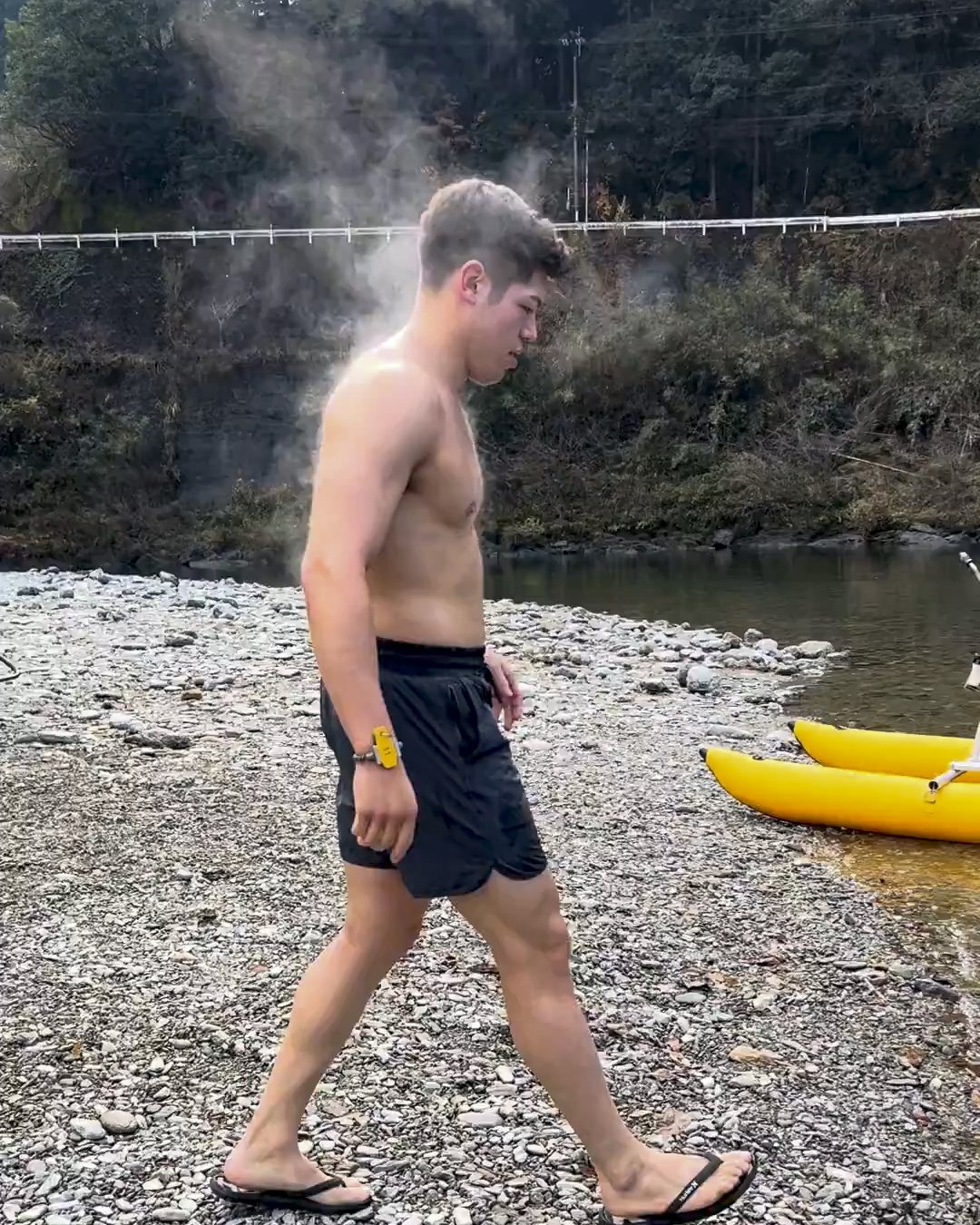 On the other hand, Yoshida and Murao enjoyed the sauna first. When you get out of the tent, the steam rises from the whole body, and go straight to the river instead of cold water bath! Everyone was enjoying the Niyodo River in winter.