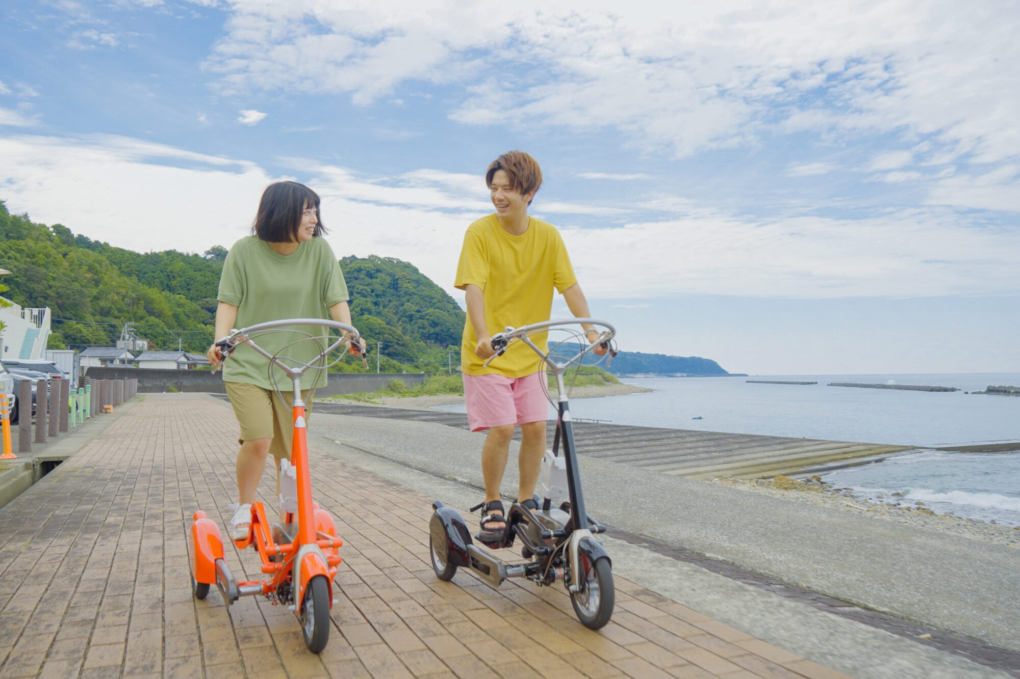 When you arrive at the Naharicho Seaside Center, where the sea spreads in front of you, play with the "walking bike" where you can ride more easily than a bicycle by stepping on the pedal as if you are walking, and the "electric kickboard" of mobility!