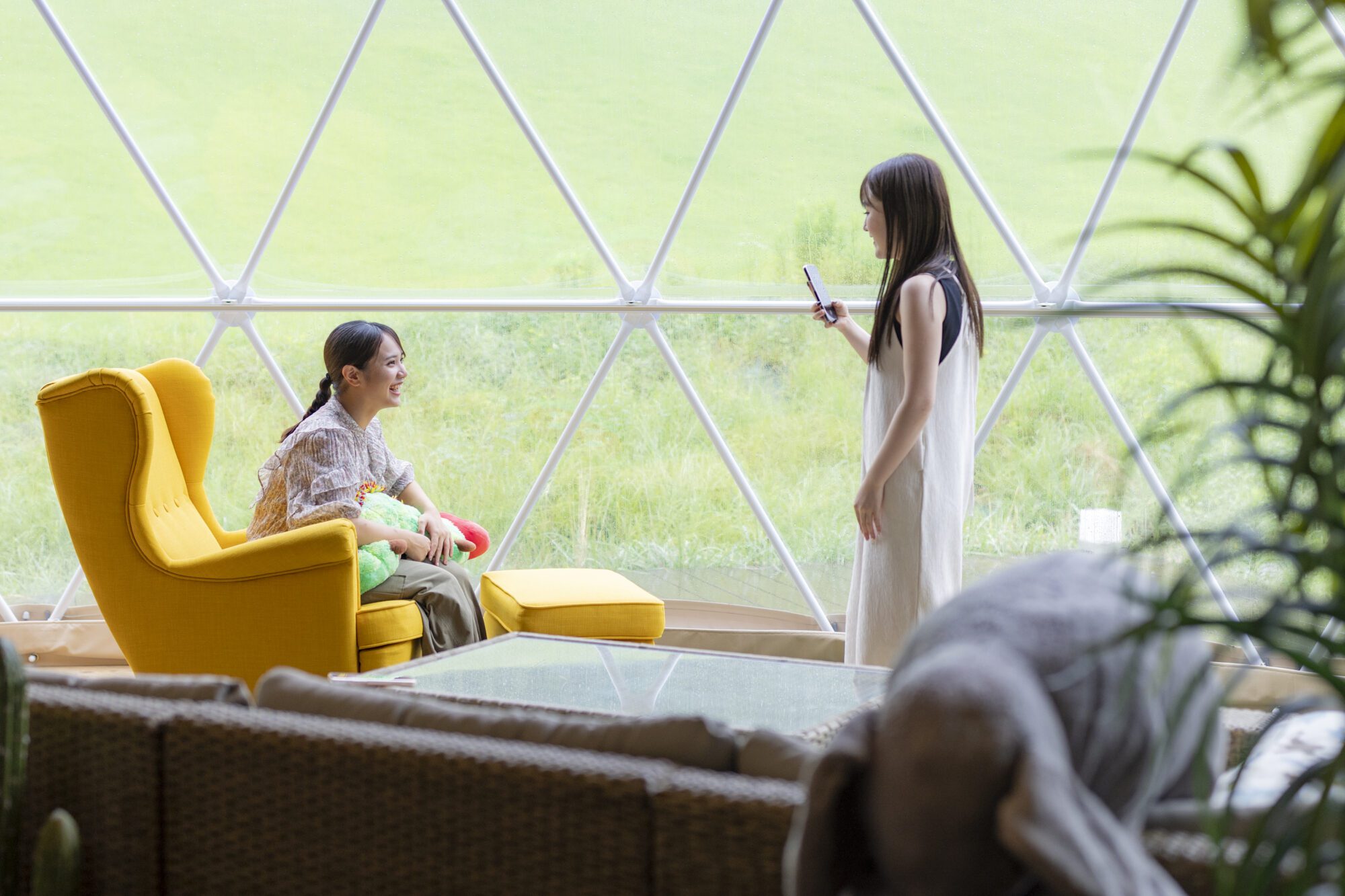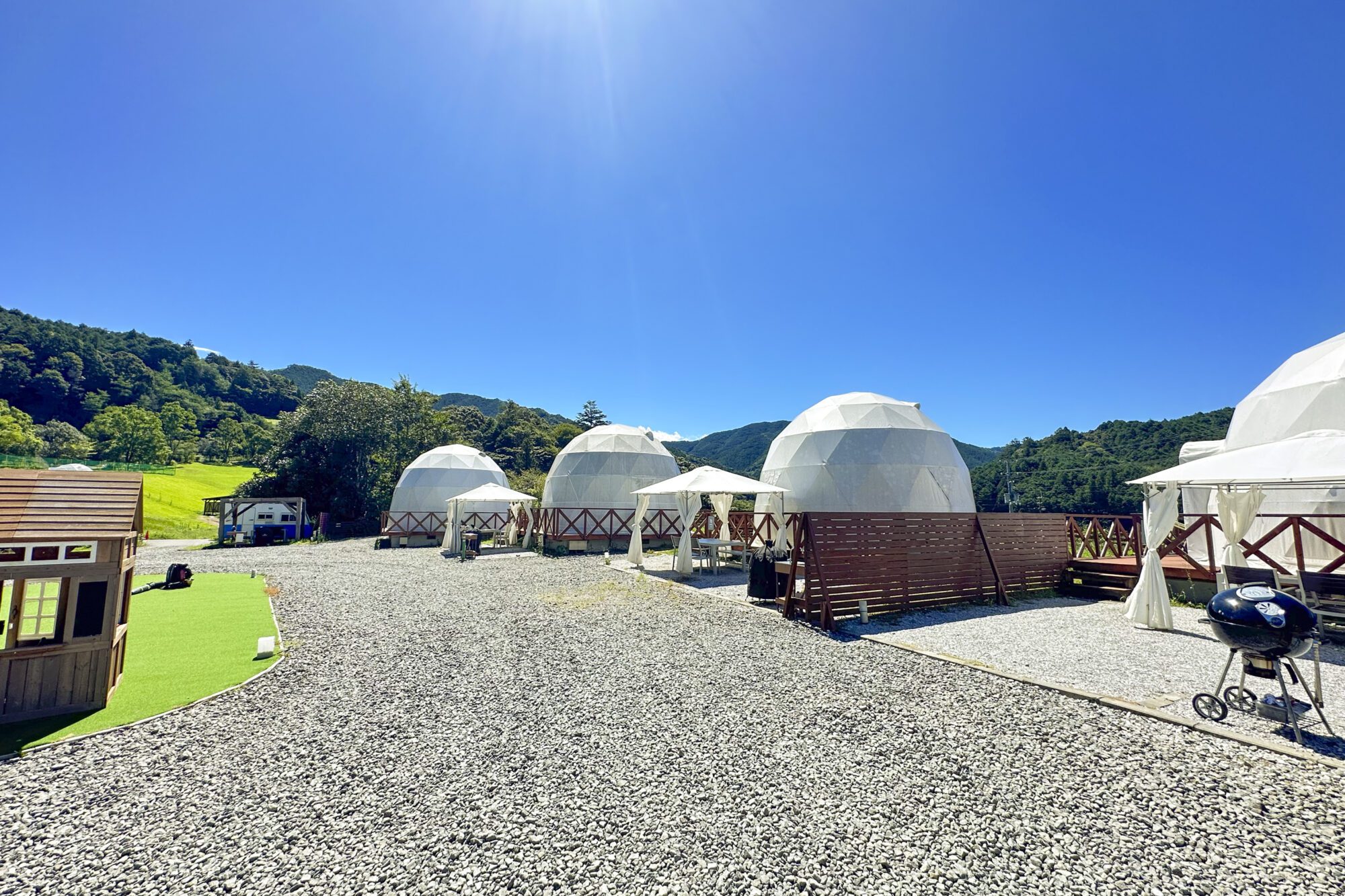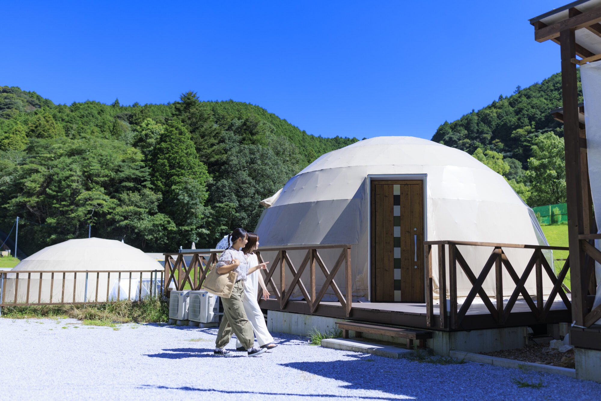 The two will stay at "Sky Hill glamping ~ Shimanto Starry Sky ~" attached to "Sky Hill Golf Club". There are 3 areas: dome tent, trailer house and autosite. This time, the two people booked a dome tent where you can enjoy a luxurious resort feeling.