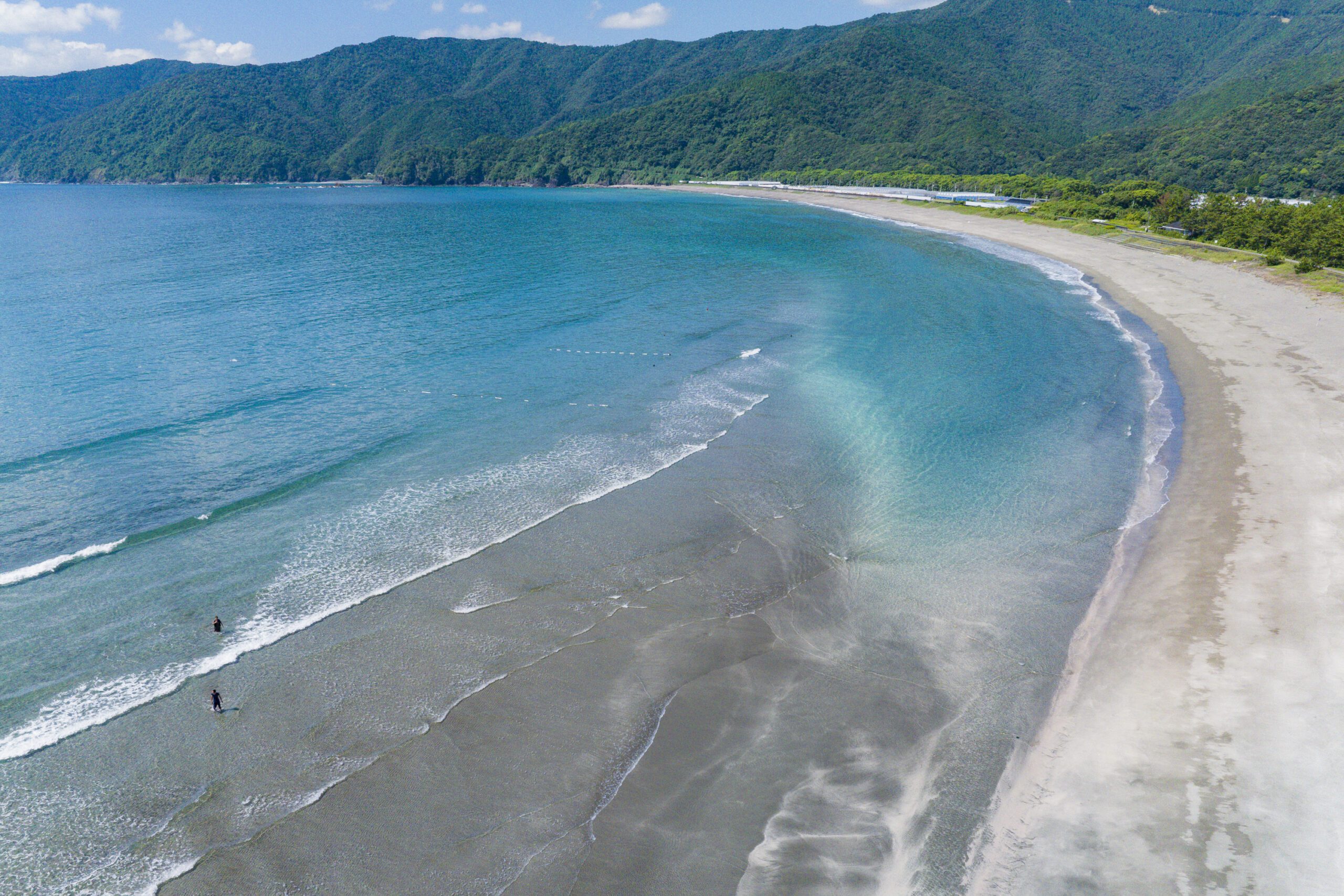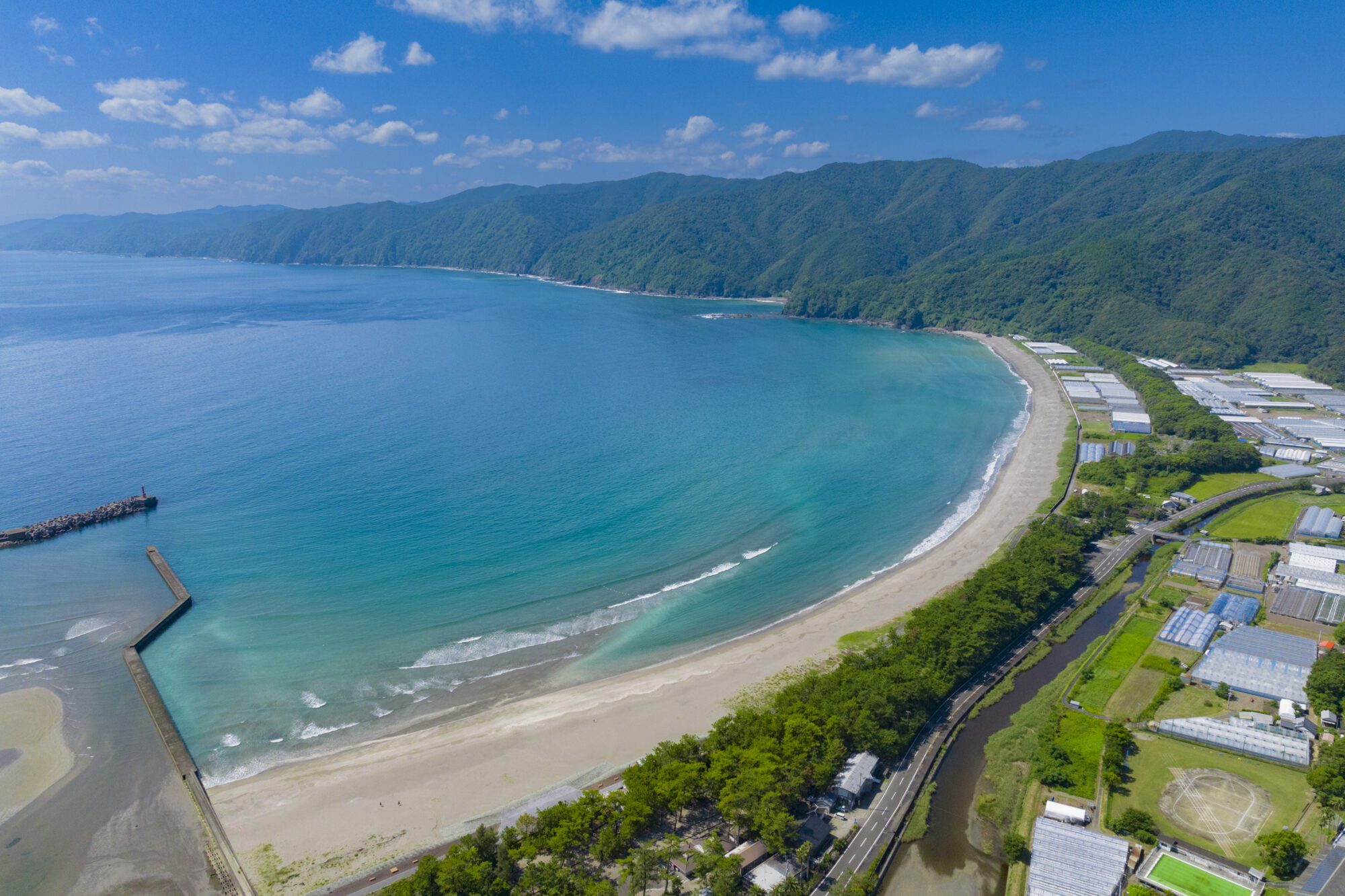 The beautiful sandy beach of Shirahama Aomatsu, which curves over about 2 km, the clear sea, and the glittering sky. A tranquil scenery spreads on one side, and your heart is healed.