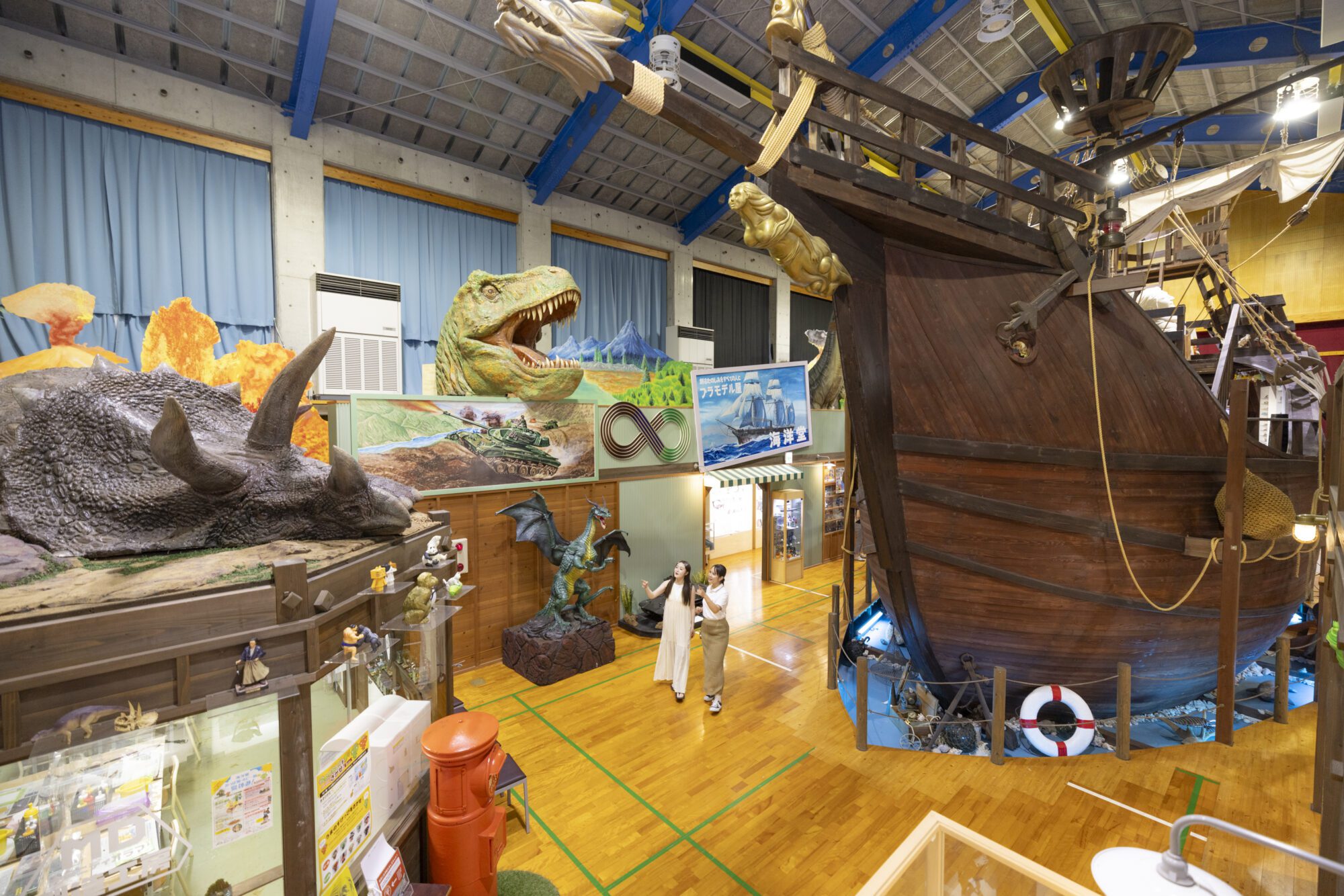 In the hall, the gymnasium floor, podium, curtain, etc. are left as it is. It is unique to Kaiyodo Hobbykan Shimanto that uses a little nostalgic gymnasium in this way. A large Catalonia ship with a central floor pulled out (there is also an exhibition space!) One of the pleasures is a playful production, such as a large dinosaur figure placed higher than your eyes.